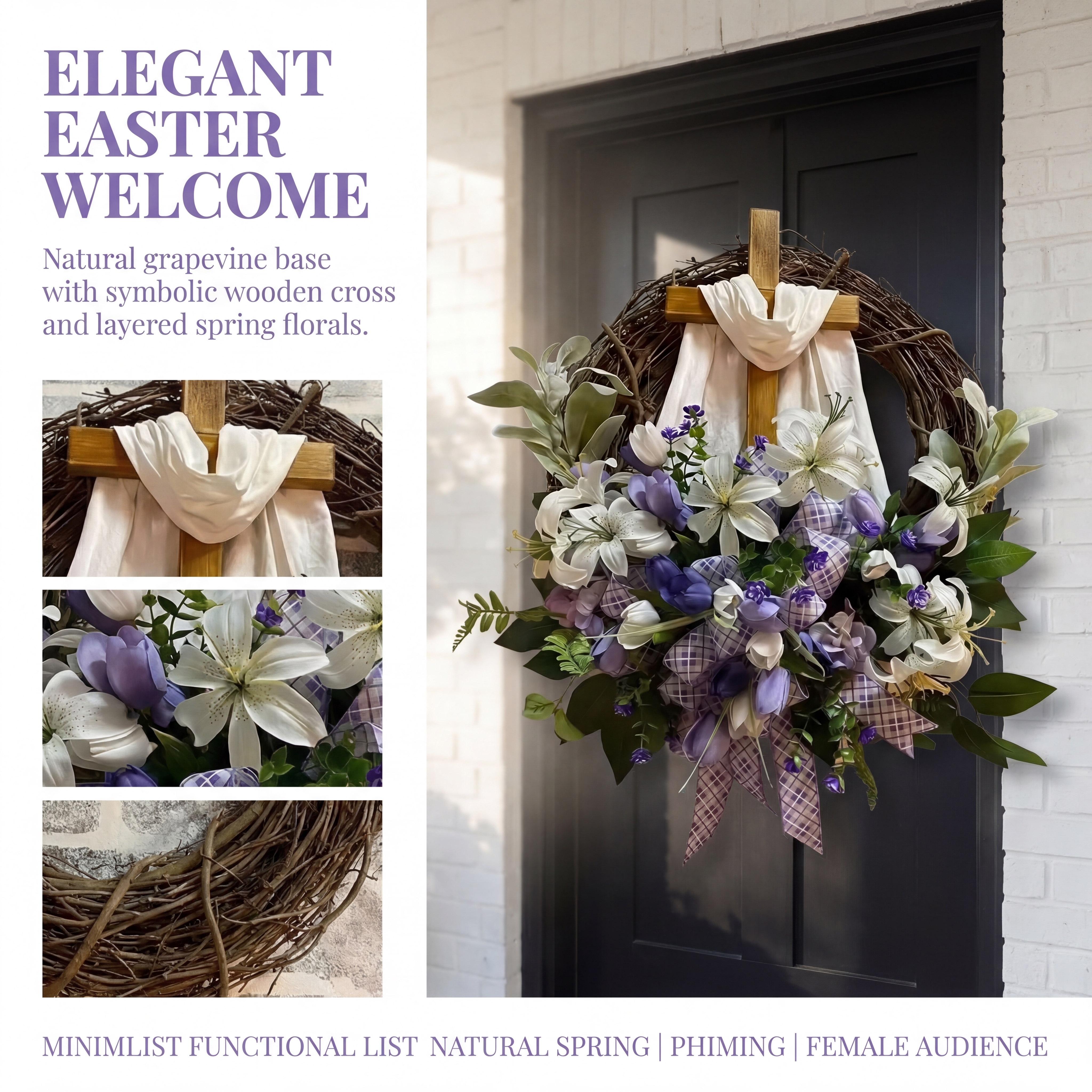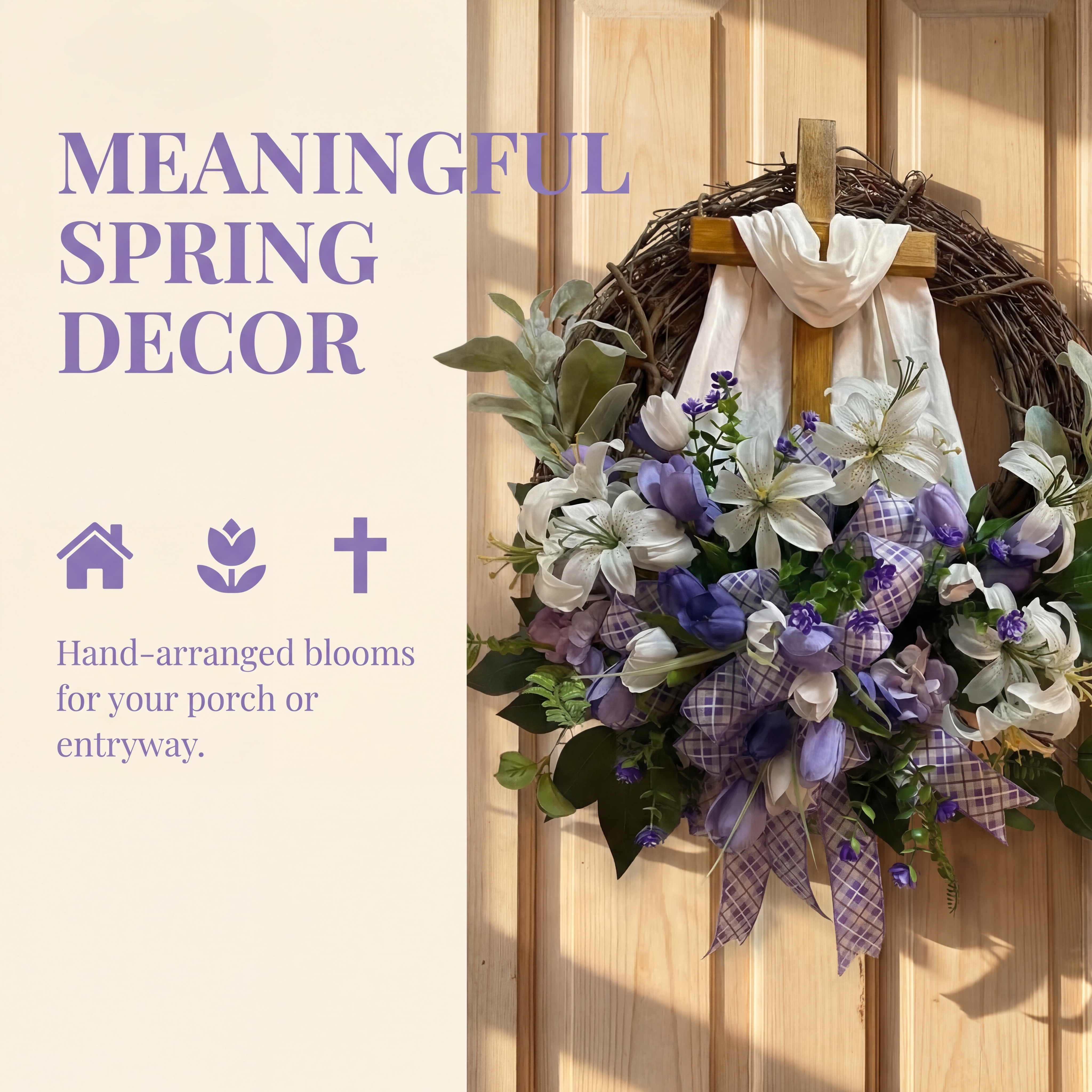 Designed as a decorative Easter wreath, this piece combines a grapevine wreath base with a wooden cross and layered artificial spring flowers. The arrangement includes white lilies, soft purple blossoms, greenery, and a patterned ribbon bow to create depth and visual texture. The lightweight design allows it to hang easily on front doors, entryways, walls, or porch spaces. Measuring approximately 17.7 inches, it offers a balanced size that stands out without overwhelming the space, making it ideal for seasonal decorating during Easter and spring.